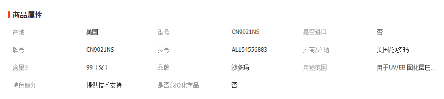 CN9021 NS丙烯酸酯產(chǎn)品描述CN9021 NS 用于UV/EB 固化層壓膠及壓敏膠配方??商峁┝己玫母街Γ犴g性及耐水性,特別對(duì)于玻璃材料。產(chǎn)品特征對(duì)玻璃附著力高伸長率耐濕產(chǎn)品性質(zhì)良好的附著力良好的耐水性高伸長率柔韌性好建議應(yīng)用層壓材料壓敏膠CN9021 NS 典型物理和化學(xué)性質(zhì)外觀清澈液體顏色,APHA100粘度,厘泊 @60℃